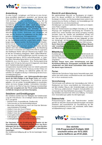 VHS benötigen wir eine schriftliche Anmeldung. Mit der destens bis eine Woche vor Beginn, bei Veranstaltungen mit
